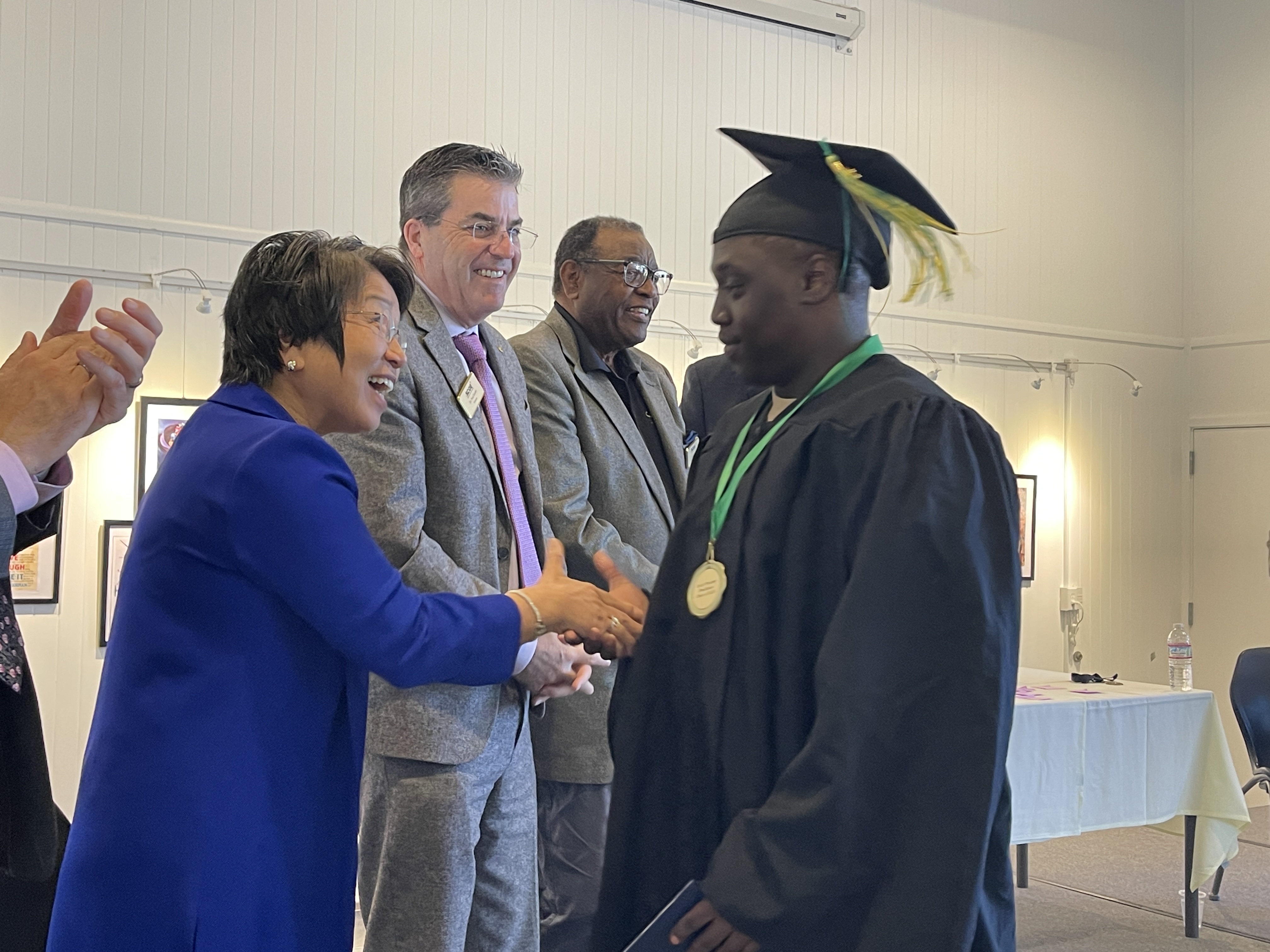 Deputy Superintendent shaking hands with a recent graduate